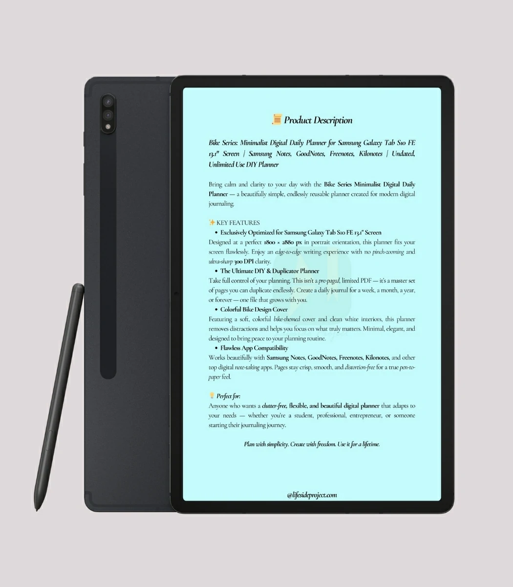 The Bike Series won’t bog you down with unnecessary structure. It’s designed to help you stay on track without feeling trapped by someone else’s system. Made specifically for the Samsung Galaxy Tab S10 FE 13.1″ and designed at 1800 × 2880 px, everything feels natural — crisp 300 DPI text, smooth pen strokes, and none of that annoying pinch-and-zoom nonsense.