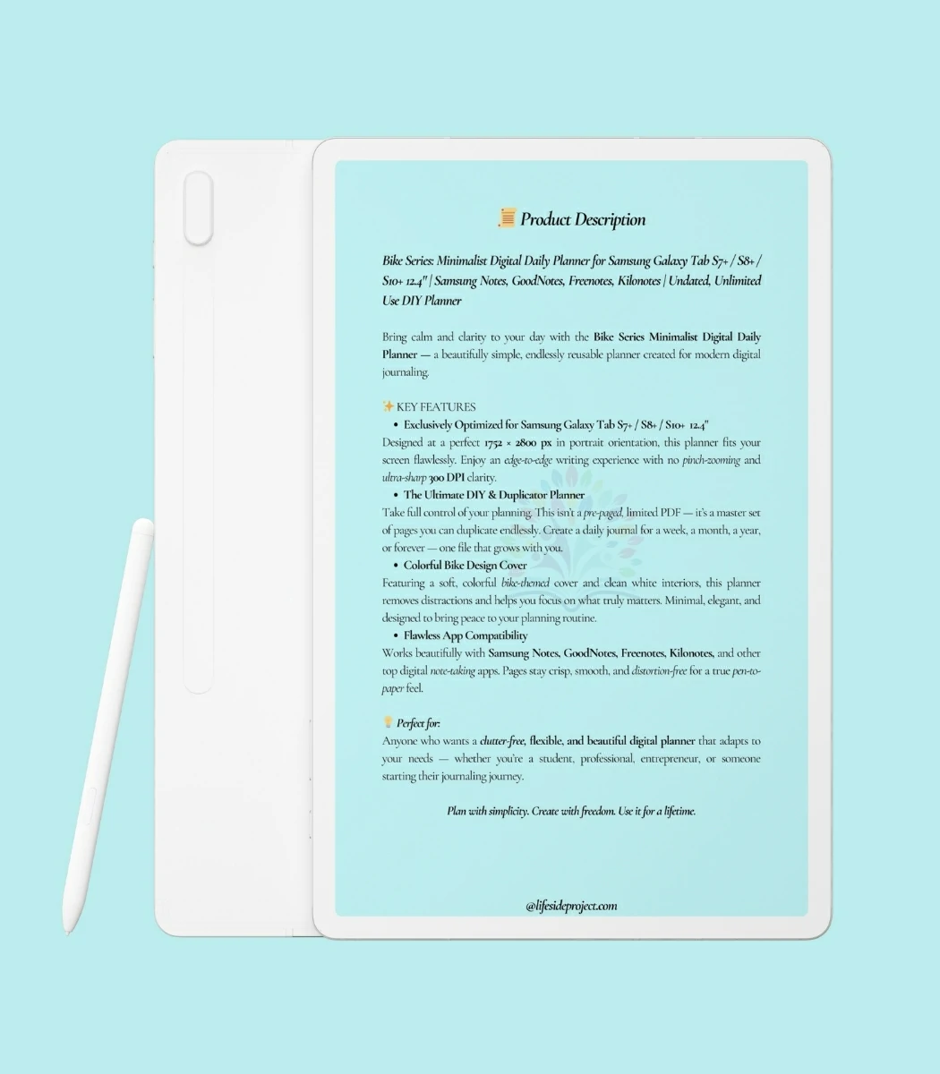 The Bike Series won’t bog you down with unnecessary structure. It’s designed to help you stay on track without feeling trapped by someone else’s system. Made for Samsung Galaxy Tab S7+ / S8+ / S10+ (12.4″ Screen) at 1752 × 2800 px, everything feels natural — crisp 300 DPI text, smooth pen strokes, and none of that annoying pinch-and-zoom nonsense.