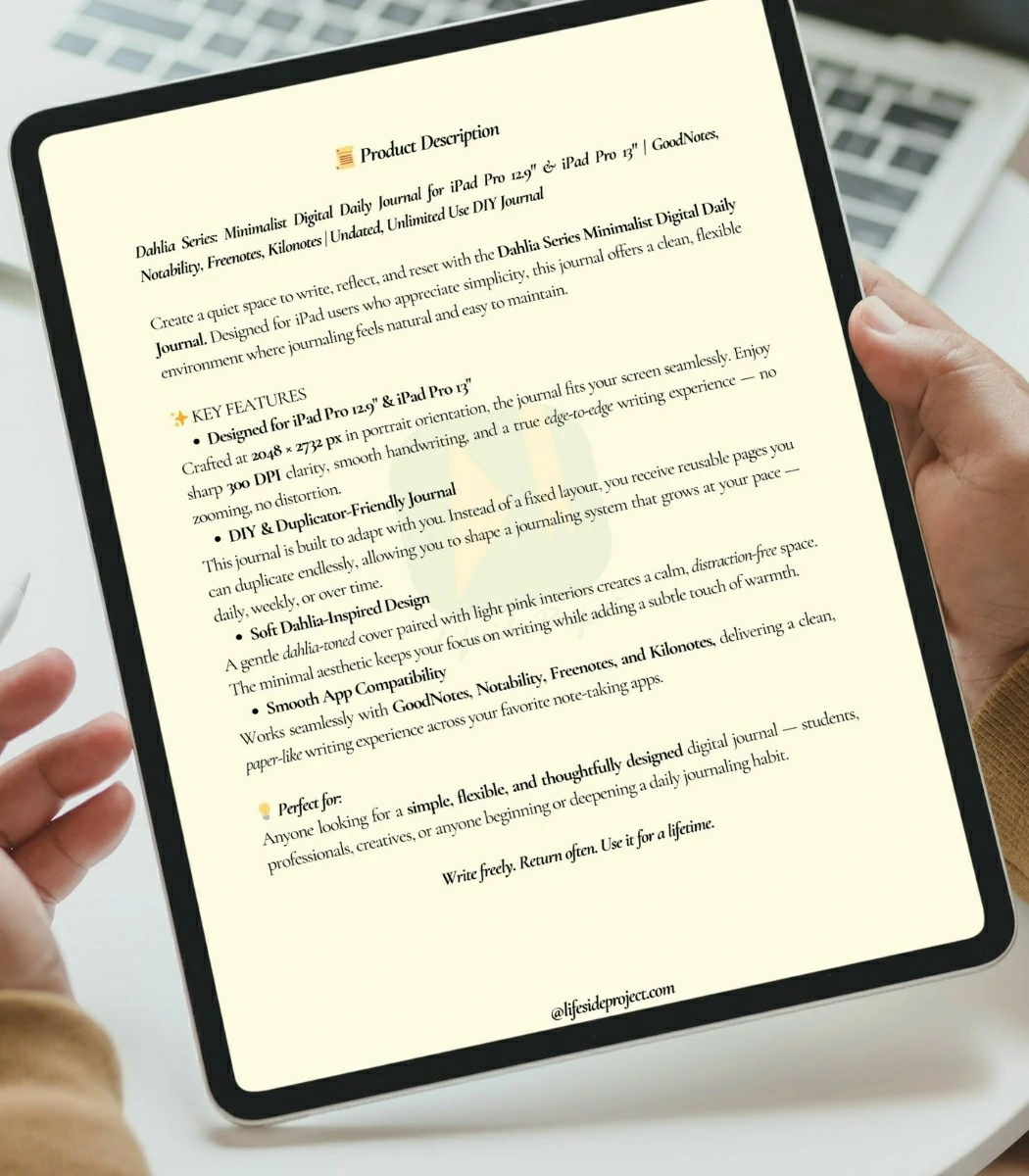This minimalist digital journal is designed to help you create a quiet, focused space for writing, reflection, and everyday clarity. Created specifically for iPad Pro 12.9″ and iPad Pro 13″, it offers a clean, flexible environment where journaling feels natural, unforced, and easy to maintain.