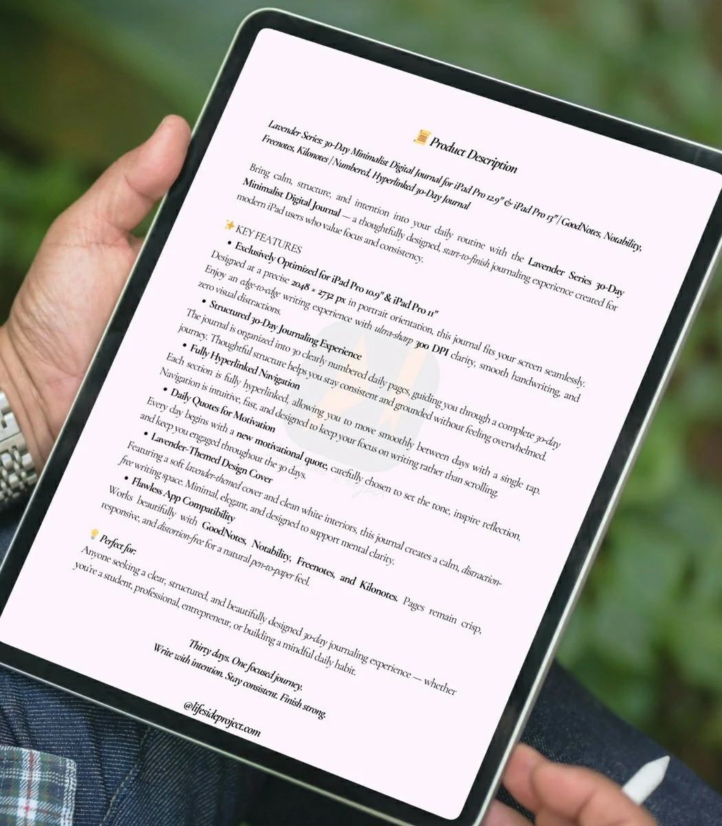 Fully compatible with GoodNotes, Notability, Freenotes, and Kilonotes, the journal is optimized for portrait use on iPad Pro devices. It is not just a journal — it is a structured one-month writing journey designed to help beginners build a strong journaling habit.