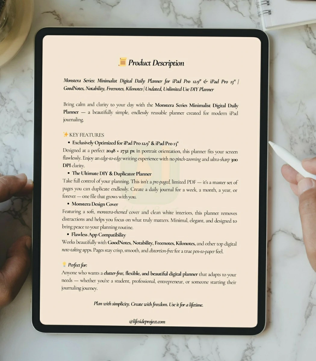 The Monstera Series is a minimalist digital planner that actually feels good to use. Made for iPad Pro 12.9″ and iPad Pro 13″, it’s designed at 2048 × 2732 px with beautiful 300 DPI clarity — so writing feels natural, smooth, and totally distraction-free.