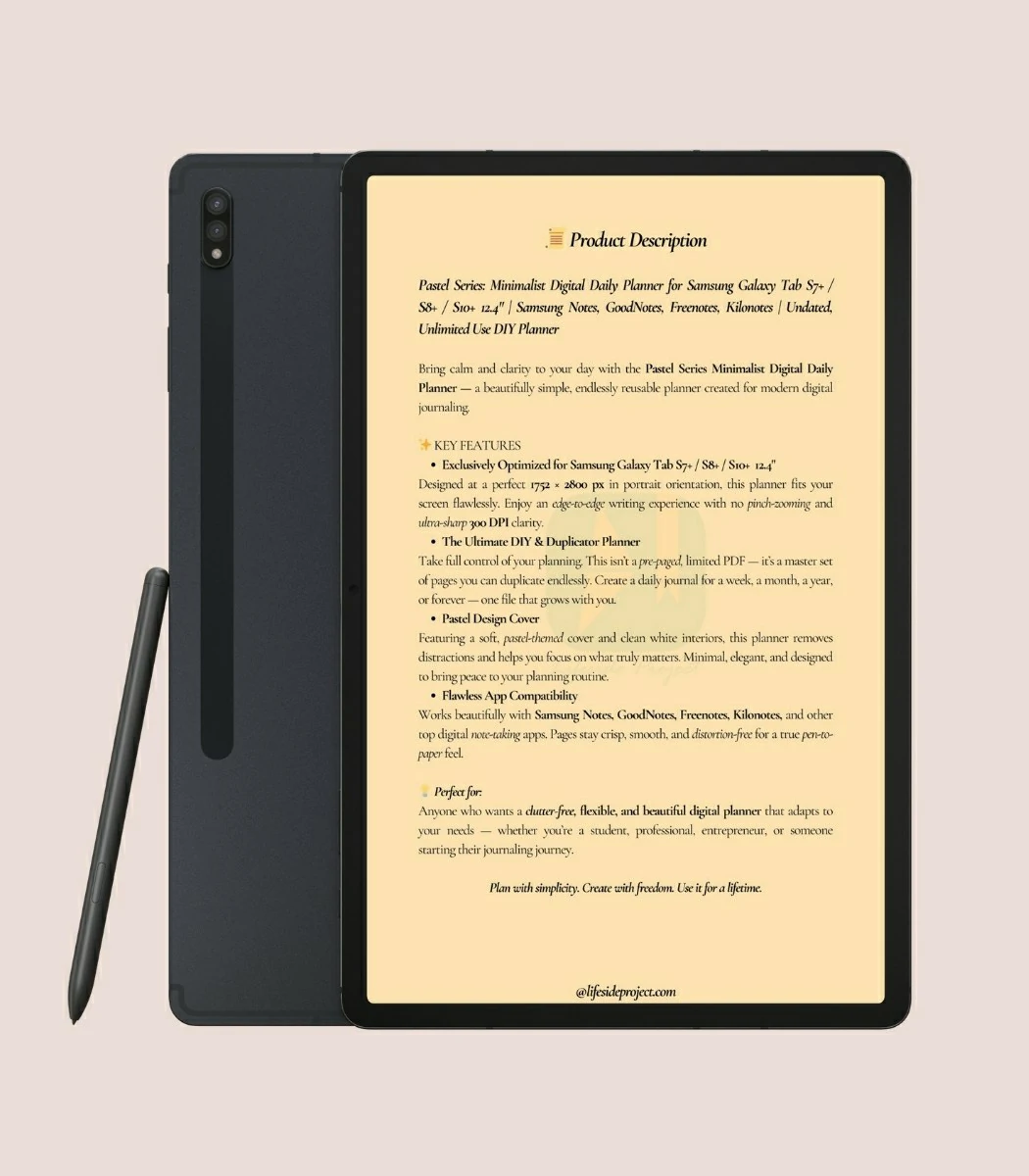 This minimalist planner for Samsung Galaxy Tab S7+ / S8+ / S10+ (12.4″ Screen) includes 5 templates for daily, weekly, and monthly planning, along with 2 blank pages for journaling, notes, or free thinking. Completely undated, you can copy what works, skip what doesn’t, and shape your own planning system. The soft Pastel Series cover adds a gentle, calming touch, while clean white interiors keep your focus clear. Delivered as a high-resolution PDF (1752 × 2800 px, 300 DPI), it works seamlessly with Samsung Notes, GoodNotes, Freenotes, and Kilonotes.