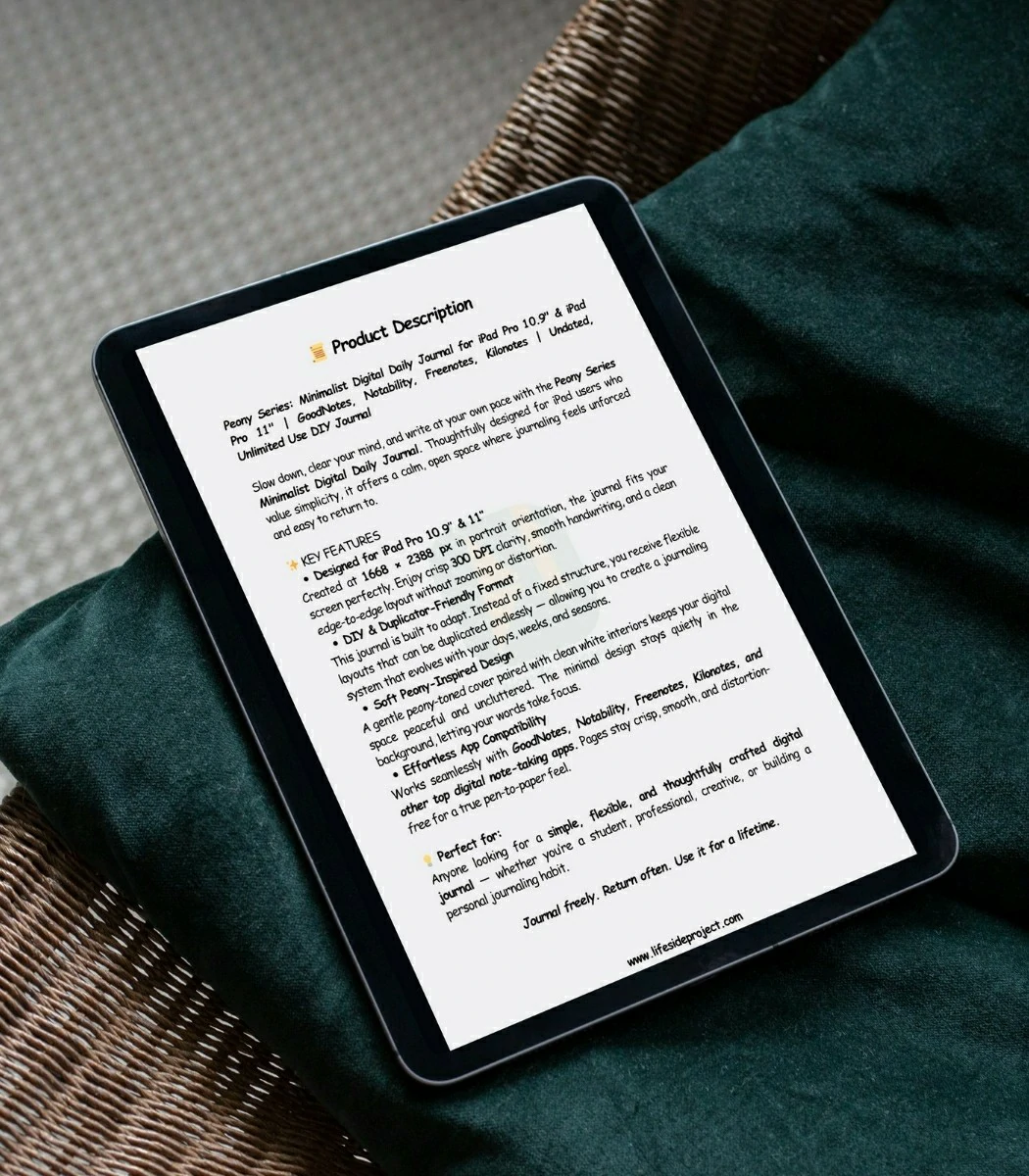 This minimalist digital journal is designed to help you slow down, clear your mind, and write at your own pace. Created specifically for iPad Pro 10.9″ and iPad Pro 11″, it offers a calm, distraction-free space where journaling feels effortless and easy to return to — even on busy days.