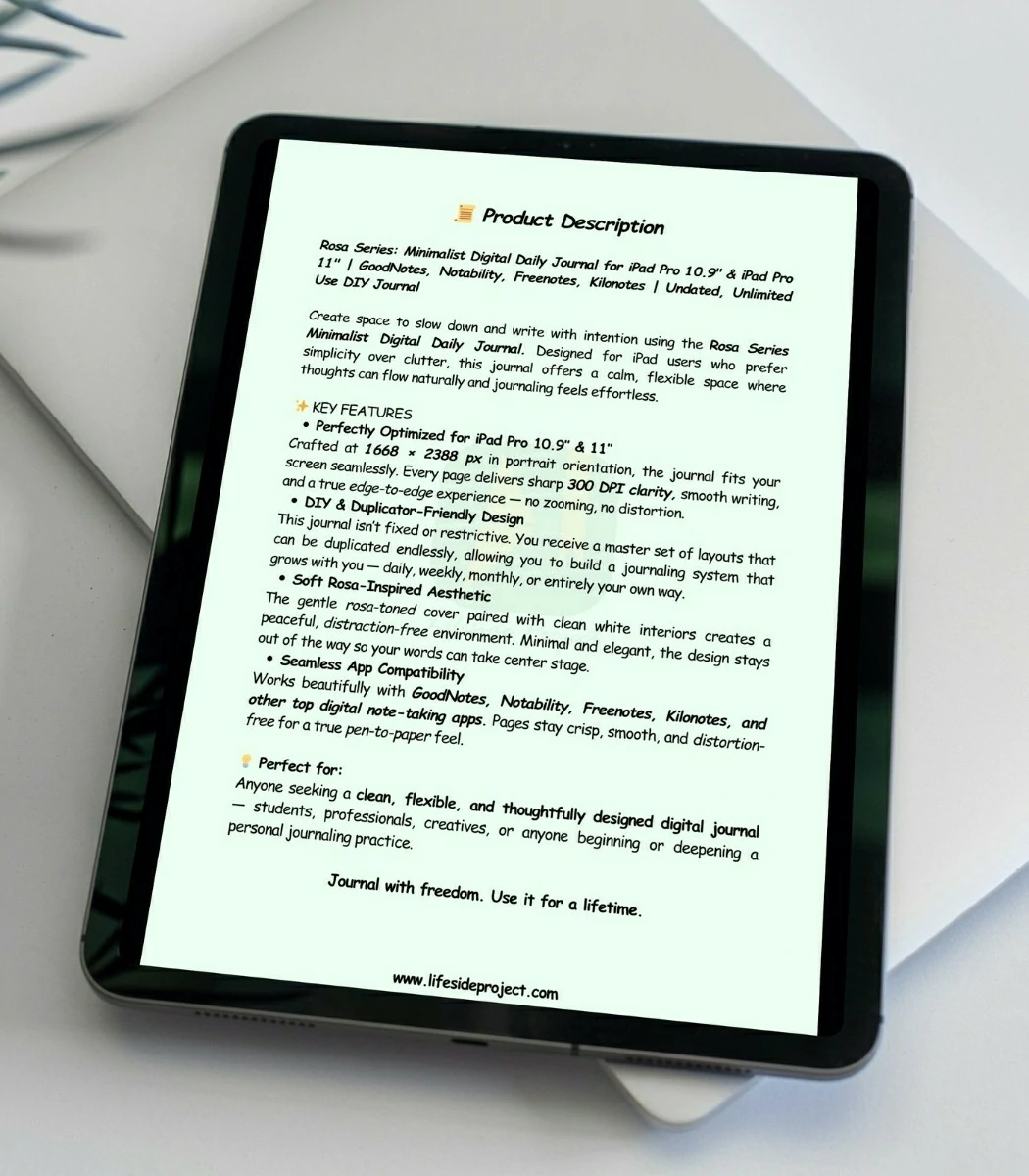 This minimalist digital journal is designed to help you slow down, reflect, and write with intention. Created specifically for iPad Pro 10.9″ and iPad Pro 11″, it offers a calm, distraction-free digital space where journaling feels effortless and natural.