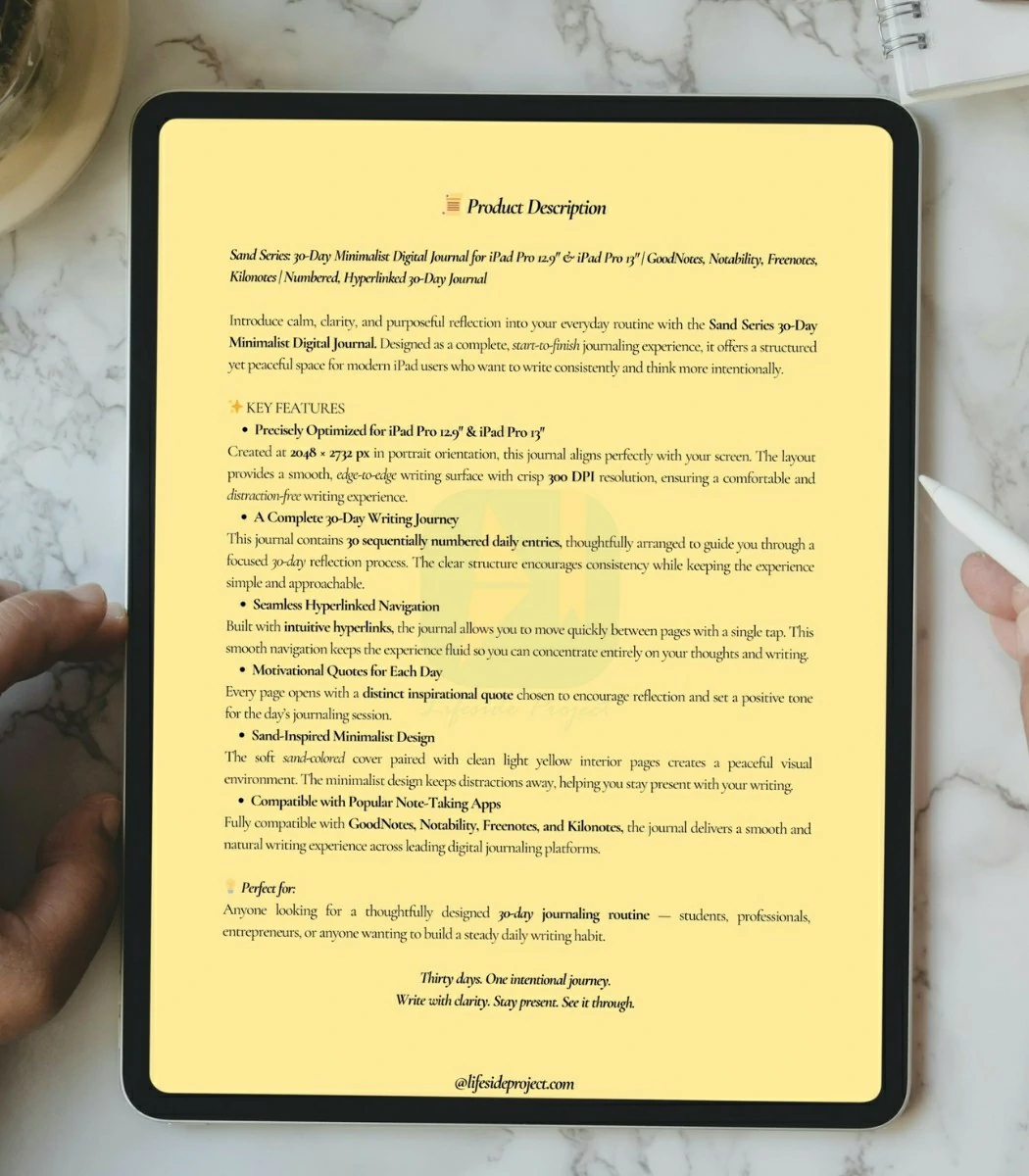 The Sand Series 30-Day Digital Journal is created for people who want to begin journaling with structure, clarity, and intention. Built specifically for iPad Pro 12.9″ and iPad Pro 13″, this journal provides a calm digital writing environment where reflection becomes a natural part of your day.