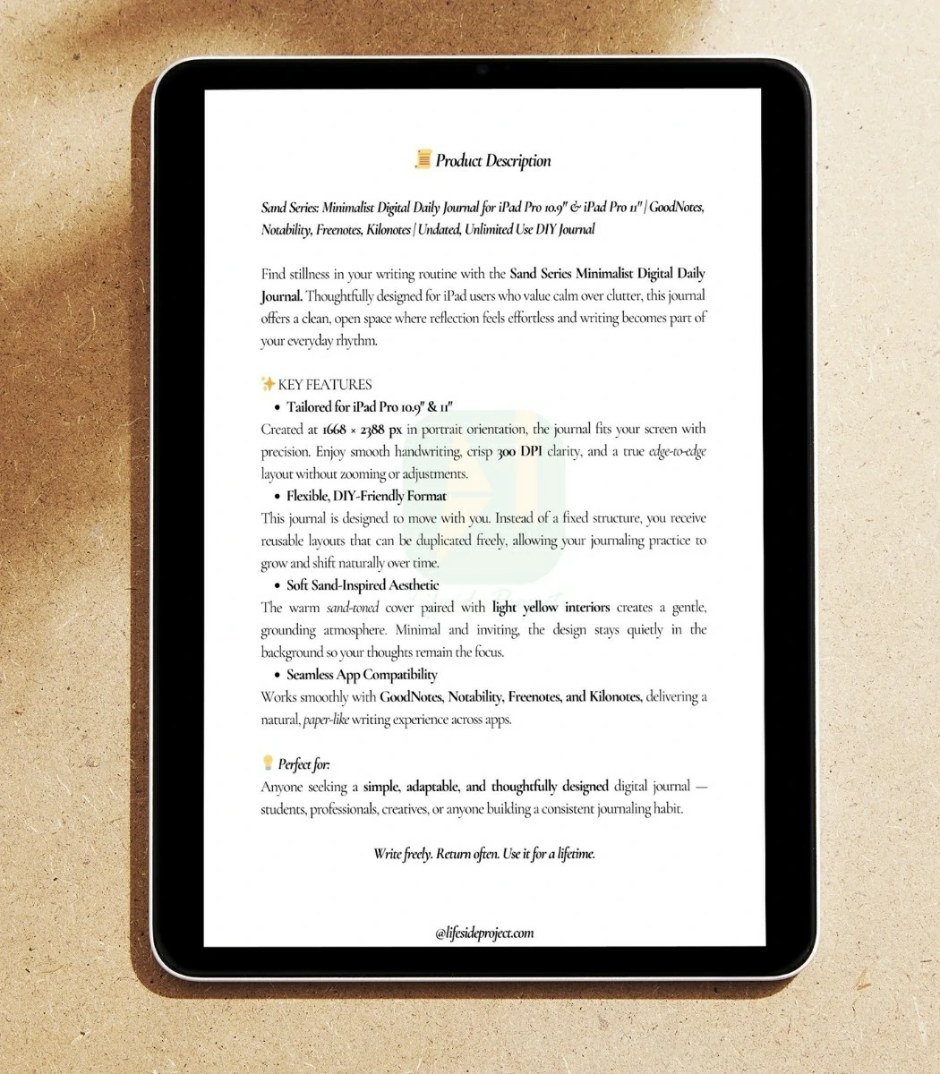 The Sand Series digital journal is designed for moments when you want to slow things down and write without distraction. Created specifically for iPad Pro 10.9″ and iPad Pro 11″, it offers a simple, open writing space that feels calm, steady, and easy to return to.