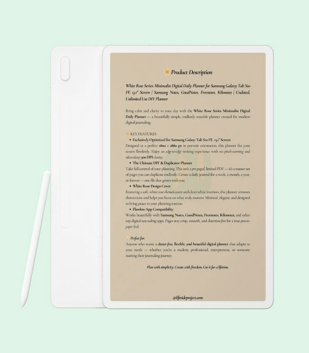 This minimalist digital planner is designed to bring calm, clarity, and intention into your daily planning. Created specifically for the Samsung Galaxy Tab S10 FE 13.1″, it offers a clean, distraction-free workspace where planning feels simple and natural.